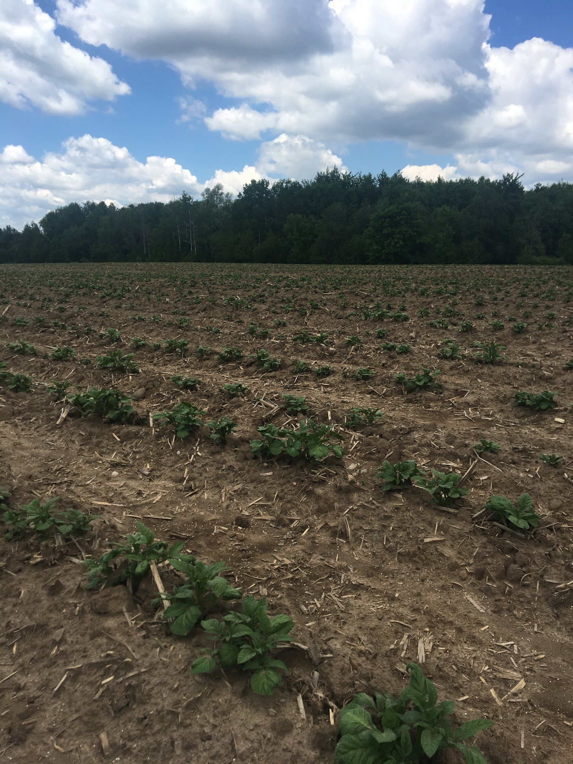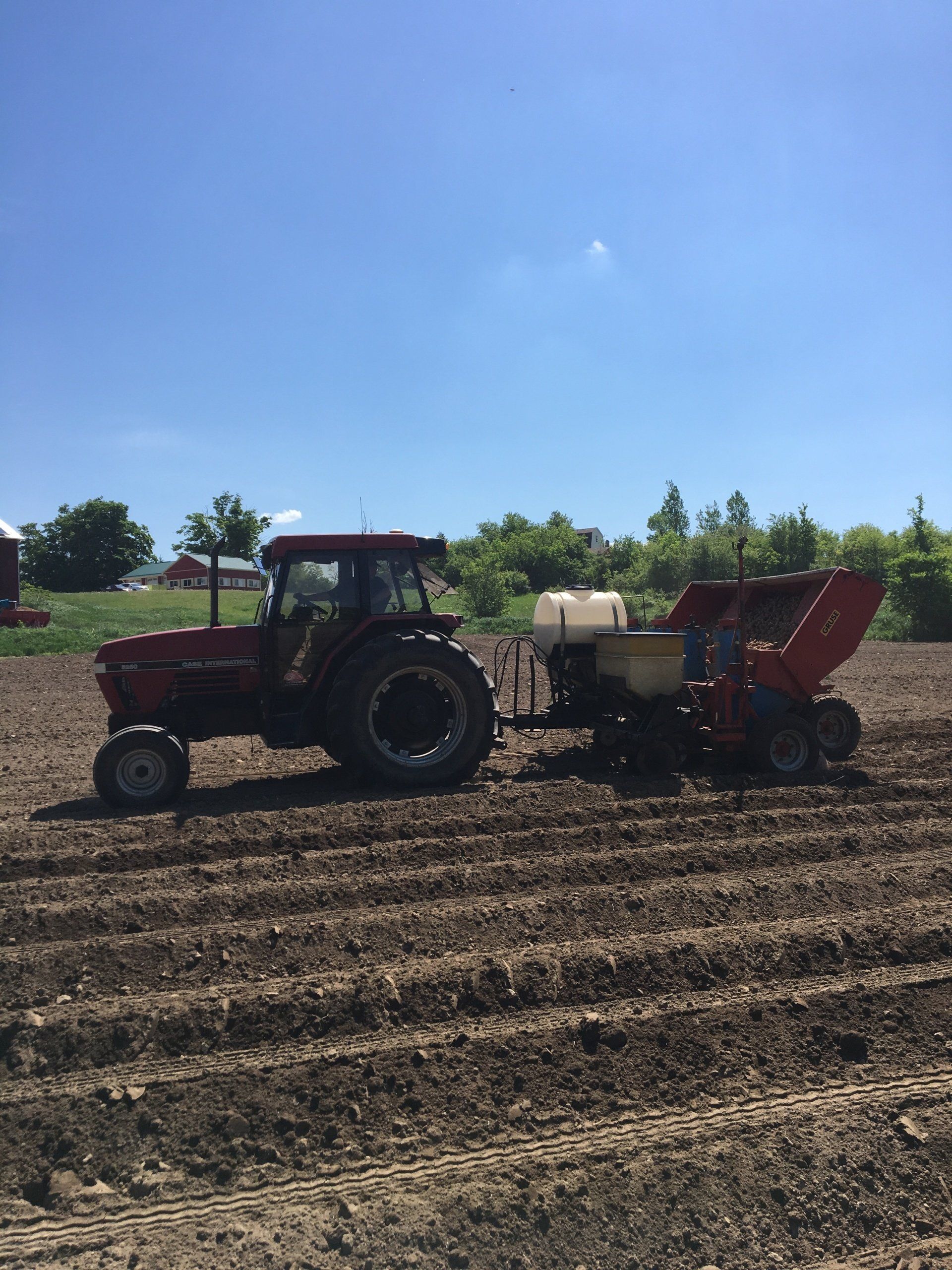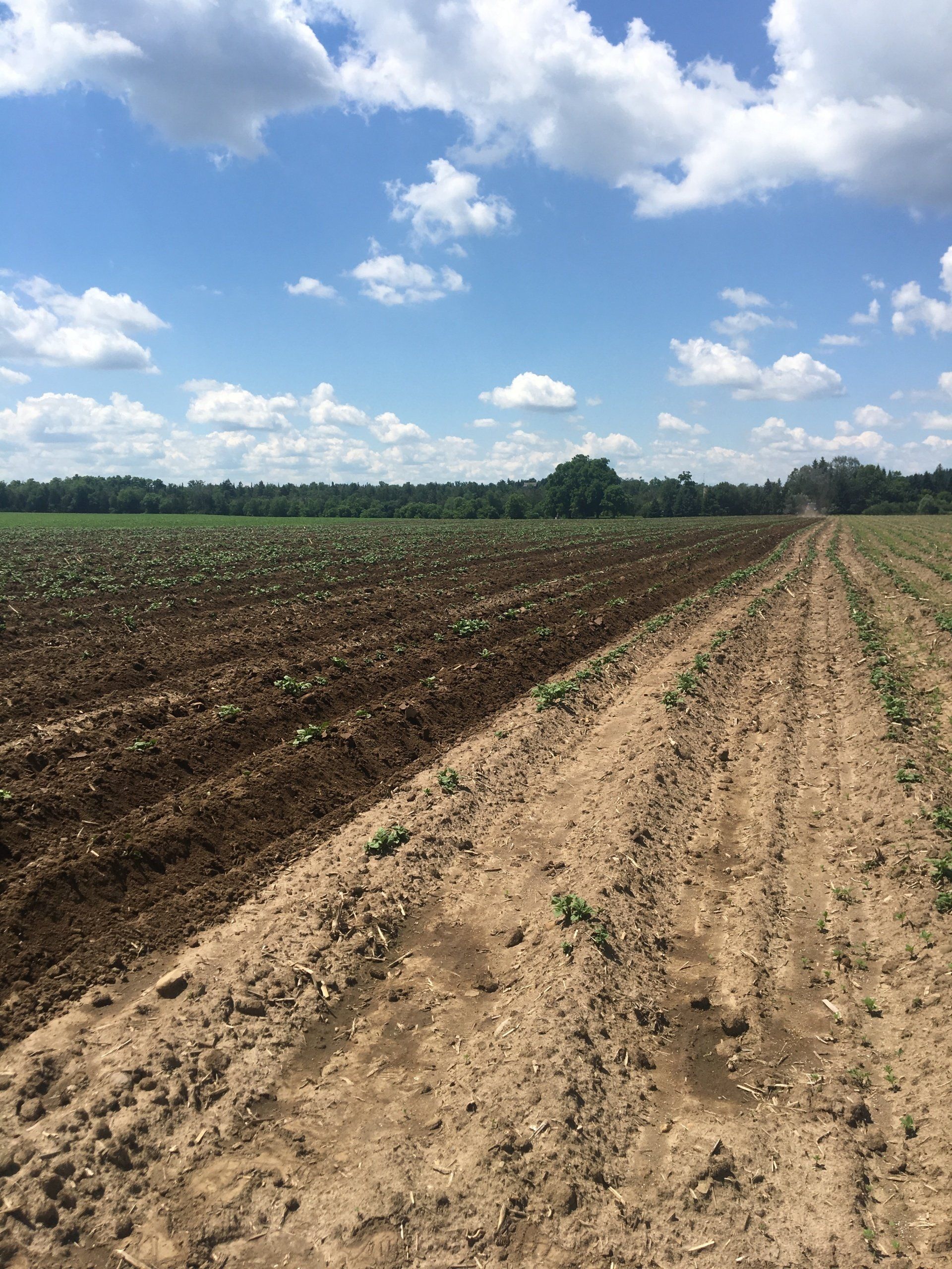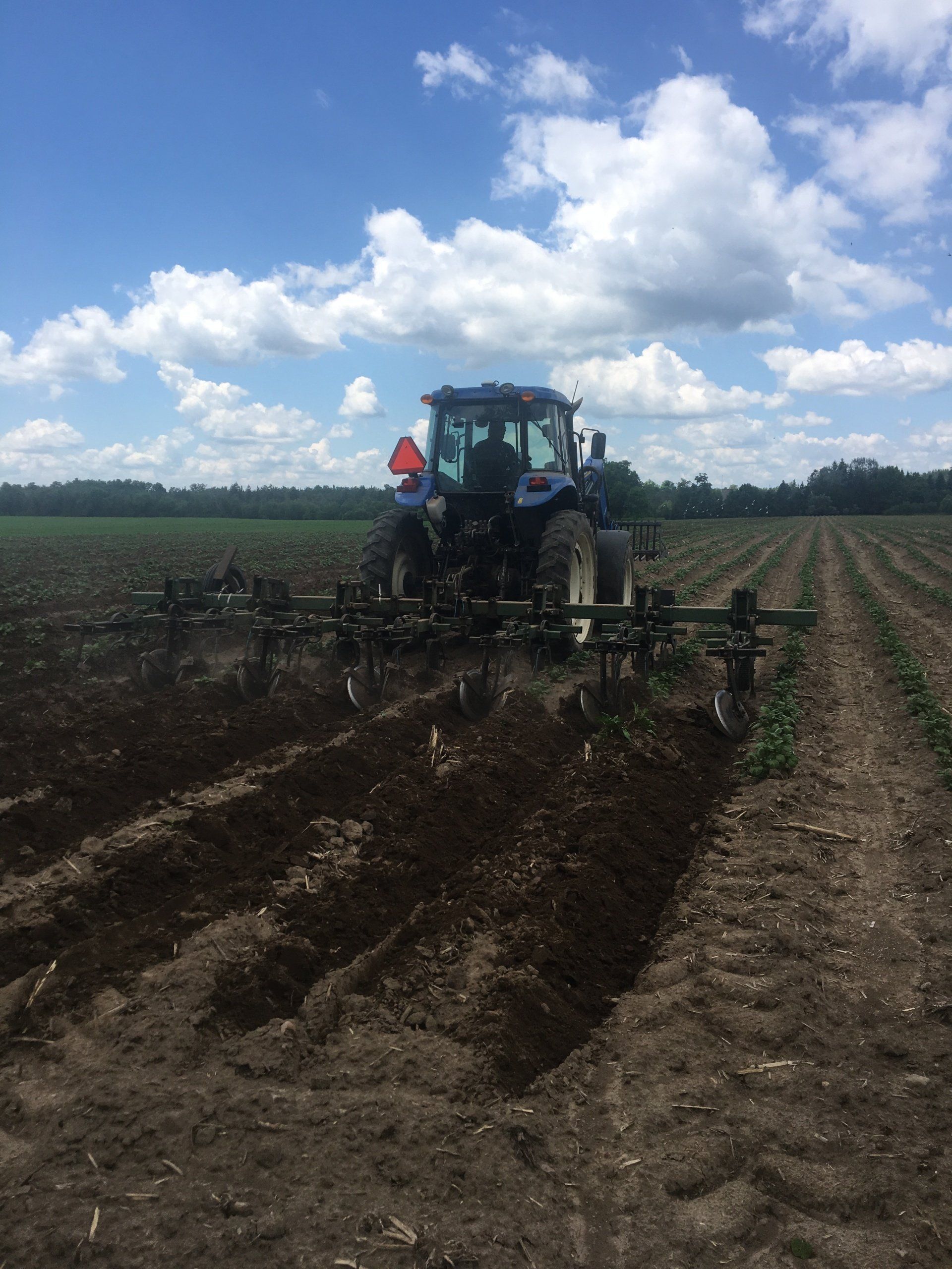 The next job that we must do in the field after plants have emerged is to “hill”. This is simply a process to move soil on top of the small hill made by the planter so that the potatoes will be well covered as they form and grow. Depending on the growth rate, amount of rain and other factors hilling may be performed more than once in the same field