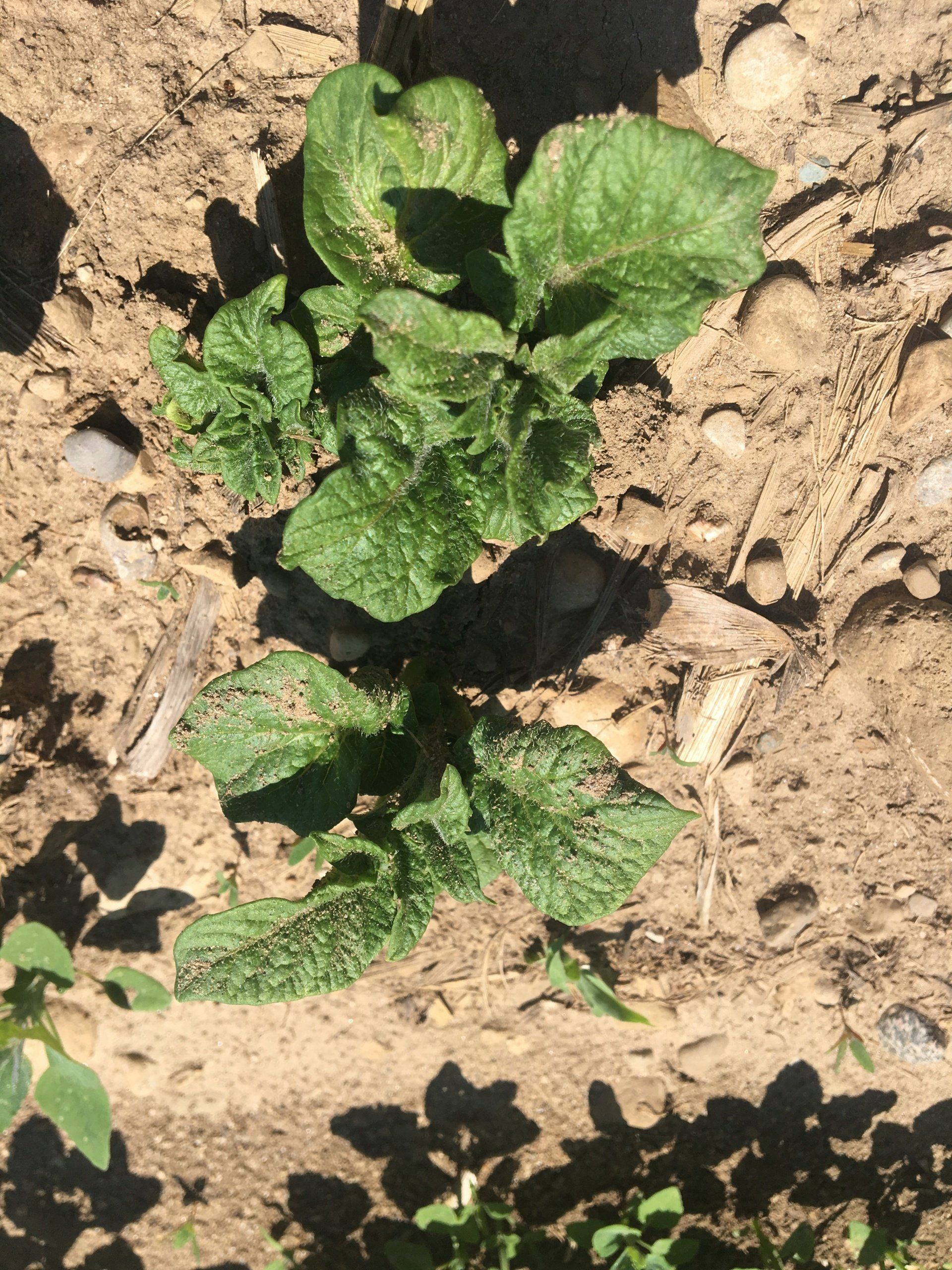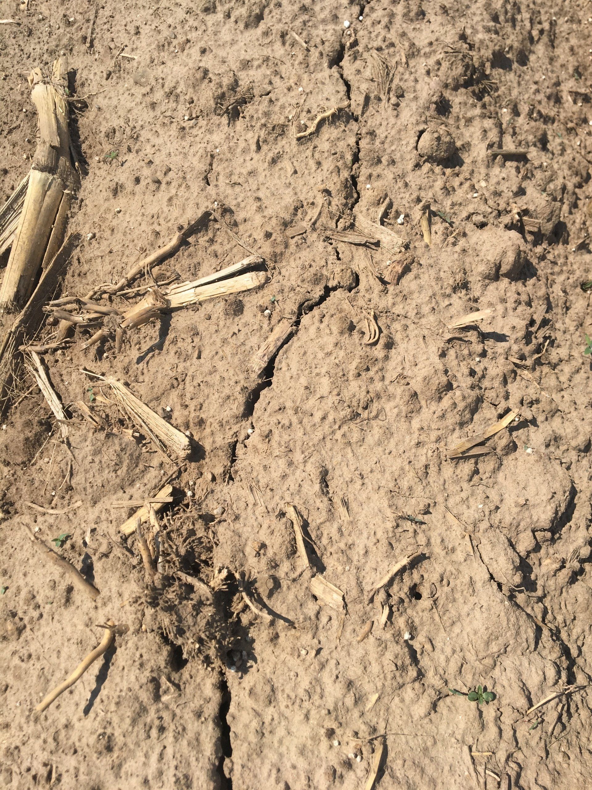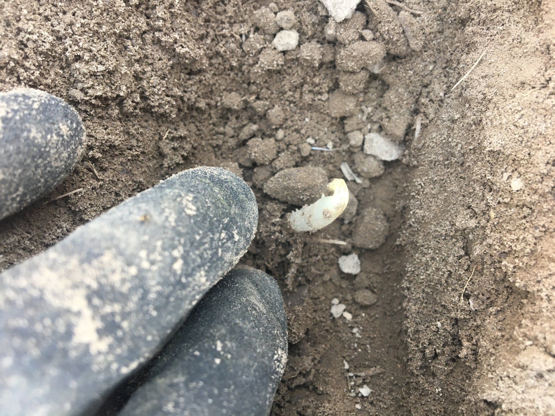 The seed piece most often has small sprouts by the time it is planted. The sprouts have a lot of work to do, using the nutrients from the seed piece as they grow and push through soil when the sun takes over and the leaves start to grow. You can see a sprout and the cracking of the ground shortly before emergence.